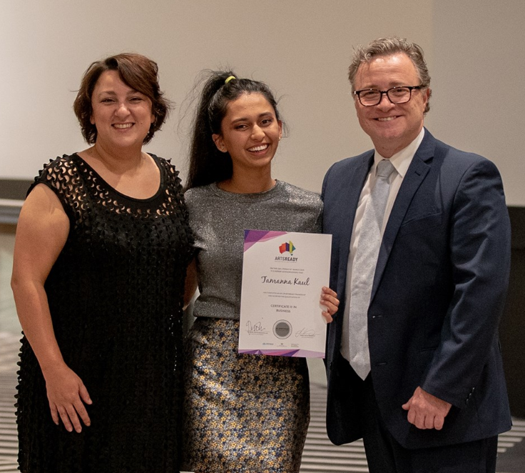 (Veronica Pardo, CEO of Multicultural Arts Victoria with Tamanna and ArtsReady General Manager, Andrew Murray at this year’s Victorian graduation ceremony)
