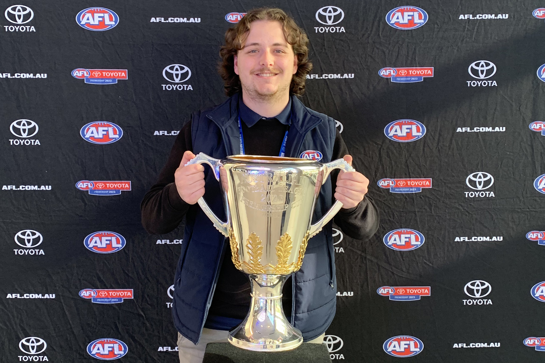 [Photo: “AFL staff were invited to a sneak peek of the brand new Stadium Square at Marvel, which involved this photo op with the Premiership cup, which was pretty awesome, felt honoured to hold something the Hawks will hold up in a years time haha” – Jono]